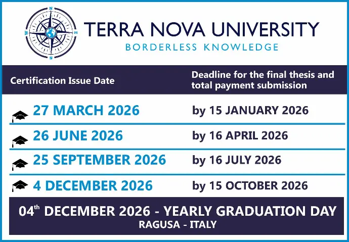 Terra Nova University è un'istituzione educativa privata. Tutti i programmi di studio sono accreditati dal WCI (World Certification Institute). Un’autorità internazionale di riferimento, istituita per riconoscere le abilità, le competenze e le pratiche professionali che riflettono le migliori pratiche accettate a livello globale, la cui missione coincide con i nostri obiettivi educativi. Un accreditamento in linea con la mission della Terra Nova University che ha scelto un'agenzia di accreditamento affidabile la cui visione e plasticità completano e si conformano perfettamente ai programmi innovativi e di successo per manager, imprenditori, dirigenti d’azienda e professionisti. La TNU e inoltre certificata ISO 9001/2015 - ISO 29990:2010 LSMS - ISO 21001:2018 EOMS.