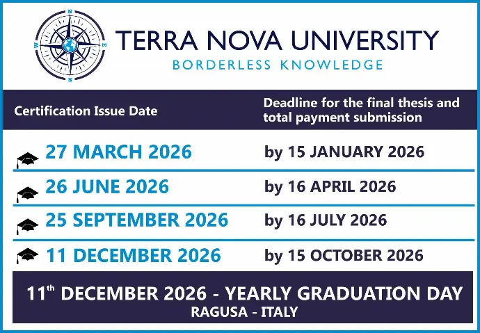Terra Nova University es una universidad internacional de postgrado registrada en el Estado de Delaware (EE.UU.) en forma de LLC, que opera en Italia como institución extranjera a través de Uniselinus Europe Networking University srl y Uniselinus Educational Group srl, empresa debidamente autorizada por las autoridades competentes en virtud del Decreto Presidencial nº 389 de 18 de abril de 1994, publicado en el Boletín Oficial de 18 de junio de 1994, nº 141, S.O.
